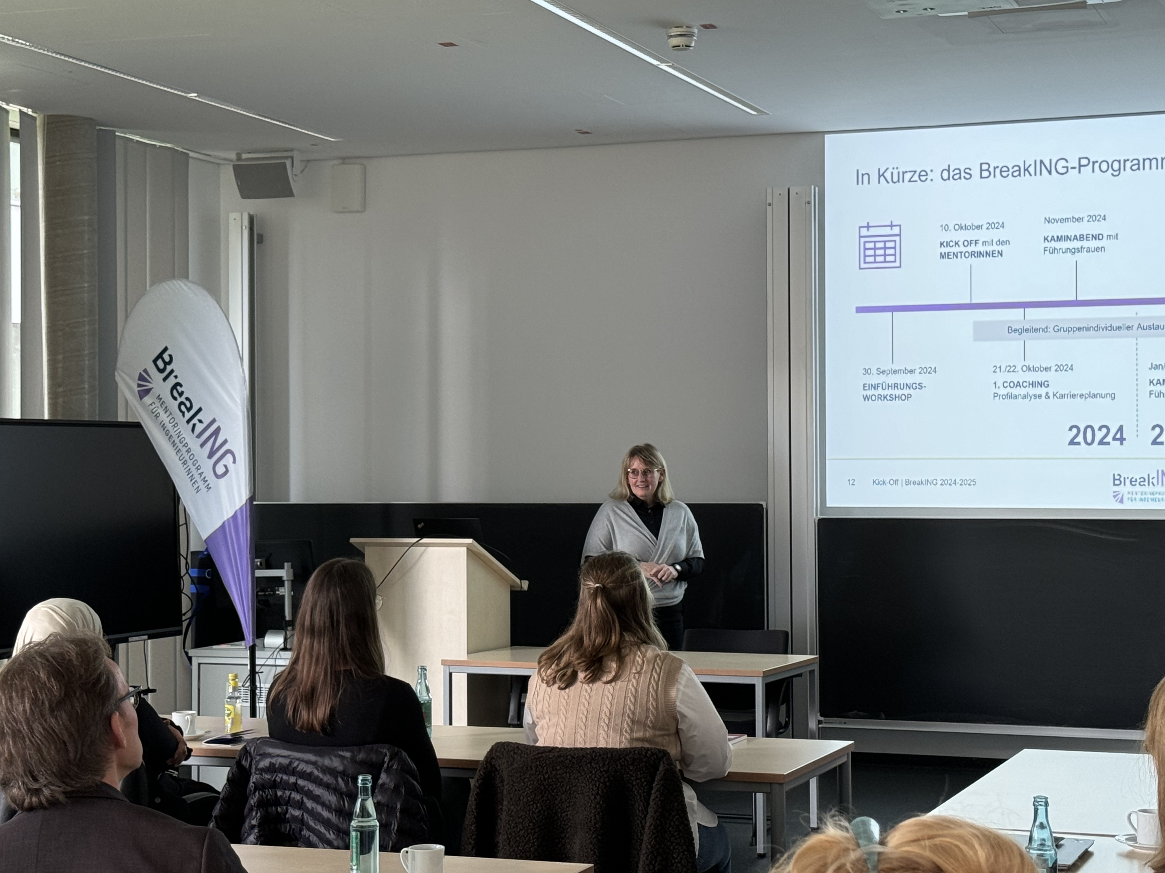 Das Kick-Off war das erste von mehreren Netzwerktreffen, bei denen das Ziel verfolgt wird, Masterstudentinnen mit erfahrenen Mentorinnen in Kontakt zu bringen. „Karrierefrauen werden nicht geboren. Erfolg erfordert Fleiß, Mut, Leidenschaft und Durchhaltevermögen.“ Mit diesen Worten eröffnete Dr.-Ing. Britta Schößer, die Initiatorin des BreakING- Mentoringprogramms und dezentrale Gleichstellungsbeauftragte der Fakultät, die Veranstaltung und gab so den Startschuss für ein weiteres Jahr voller Austausch, Lernen und persönlicher Weiterentwicklung.