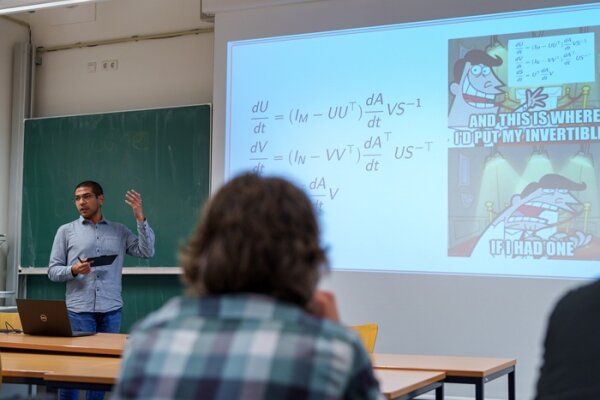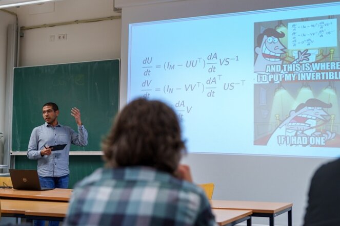 After lunch together in the RUB cafeteria, Dr. Antonio Bräunche and Dr. Felix Wagner (himself an RUB alumnus) from BGC opened the program with an industry lecture on generative AI in research and business. This was followed by ten presentations in the so-called Contributed Sessions, in which participants were able to exchange ideas about their research work in the fields of mathematics and mechanics in an informal atmosphere. The event concluded with a joint dinner at the Uni-Center.